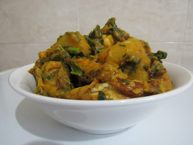 Nigerian yam porridge cooked with smoked mackerel and green vegetables. Easy recipe. Dinner is served.